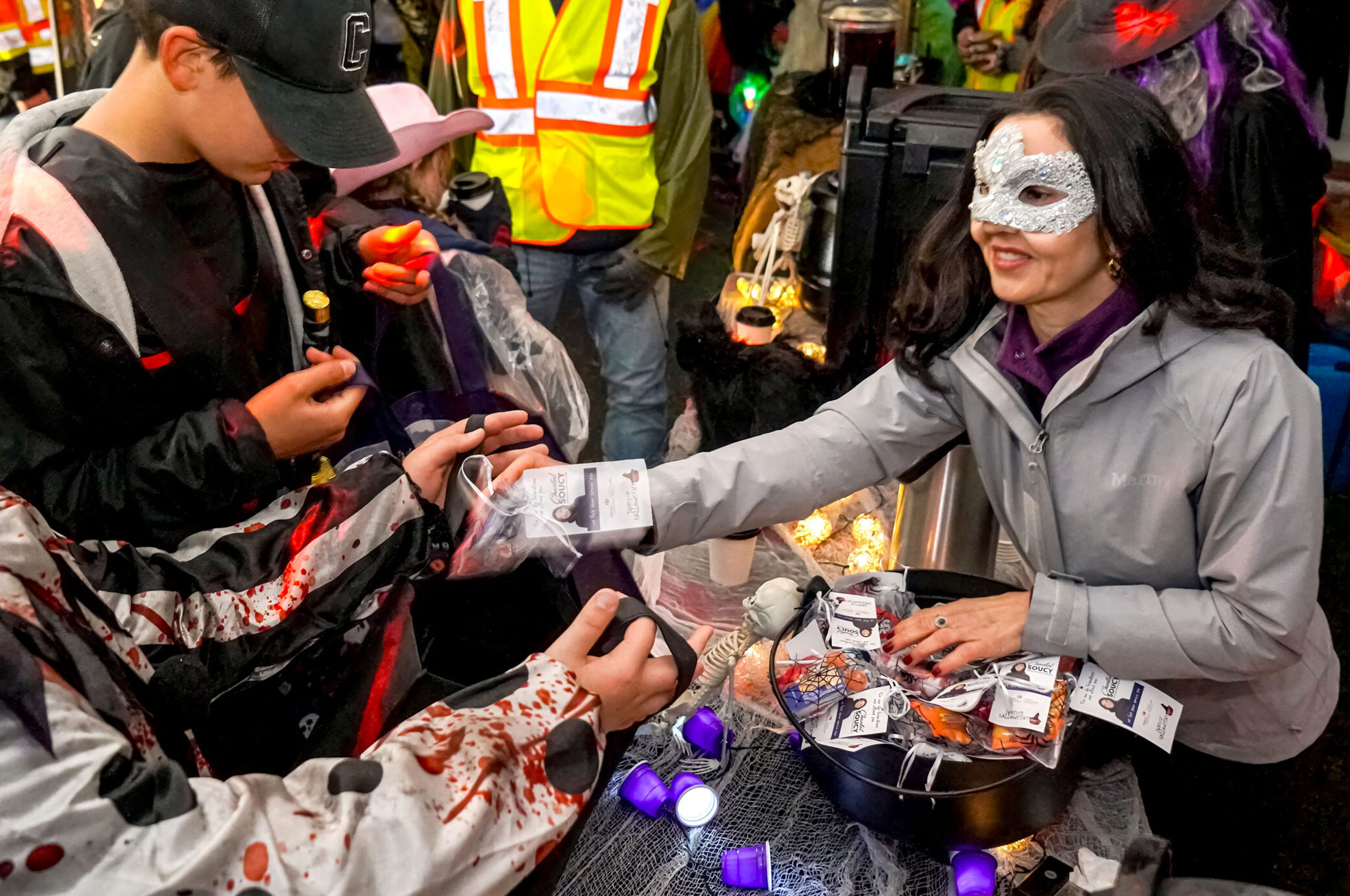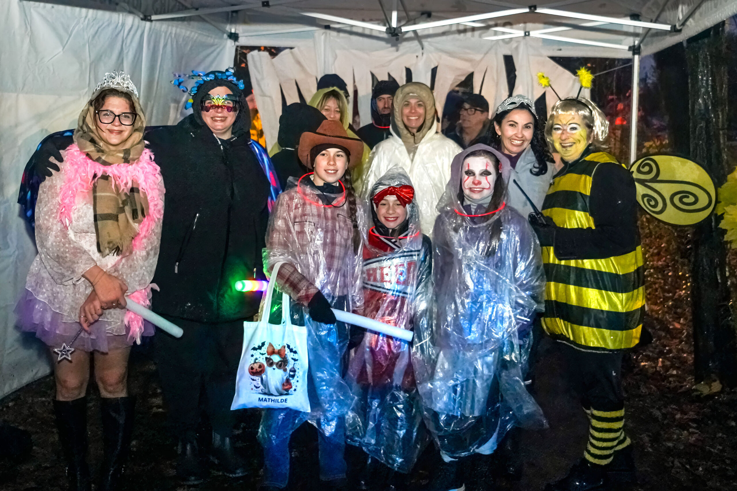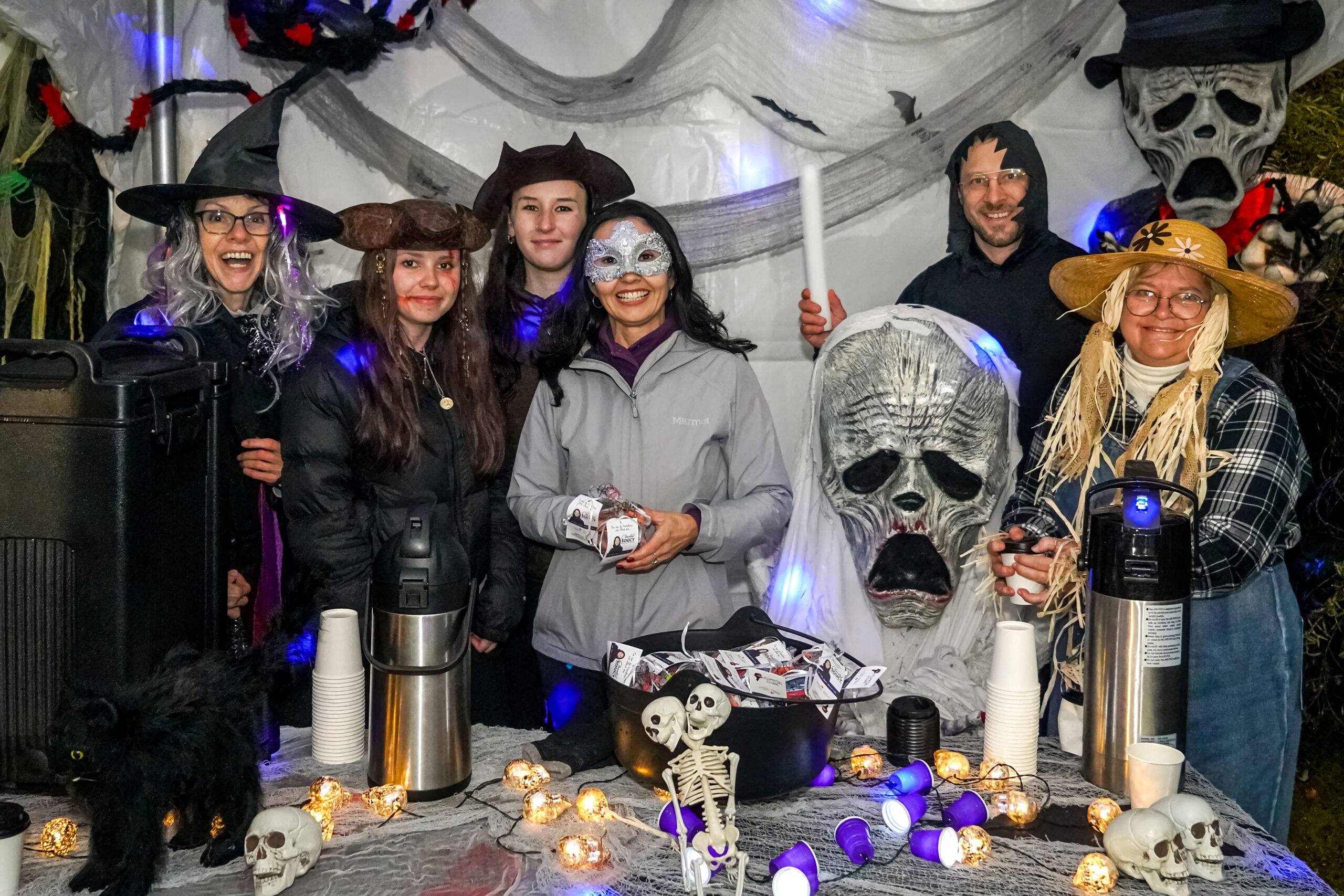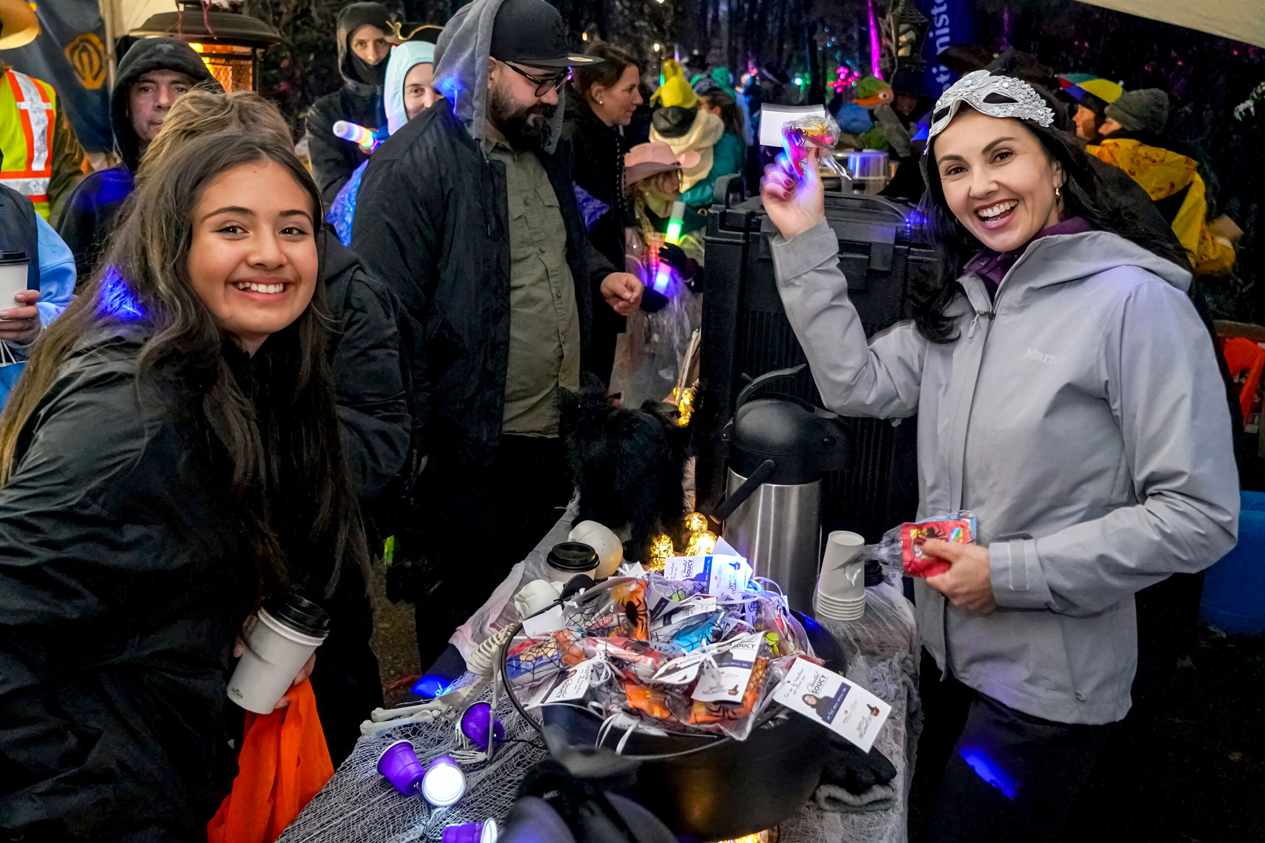 Malgré la pluie, des centaines de visiteurs ont bravé la température pour se rassembler sous le grand chapiteau du parc Jean-Jacques-Leduc, dans le quartier Douville. Mme Soucy et son équipe y ont offert bonbons et chocolat chaud dans une ambiance chaleureuse