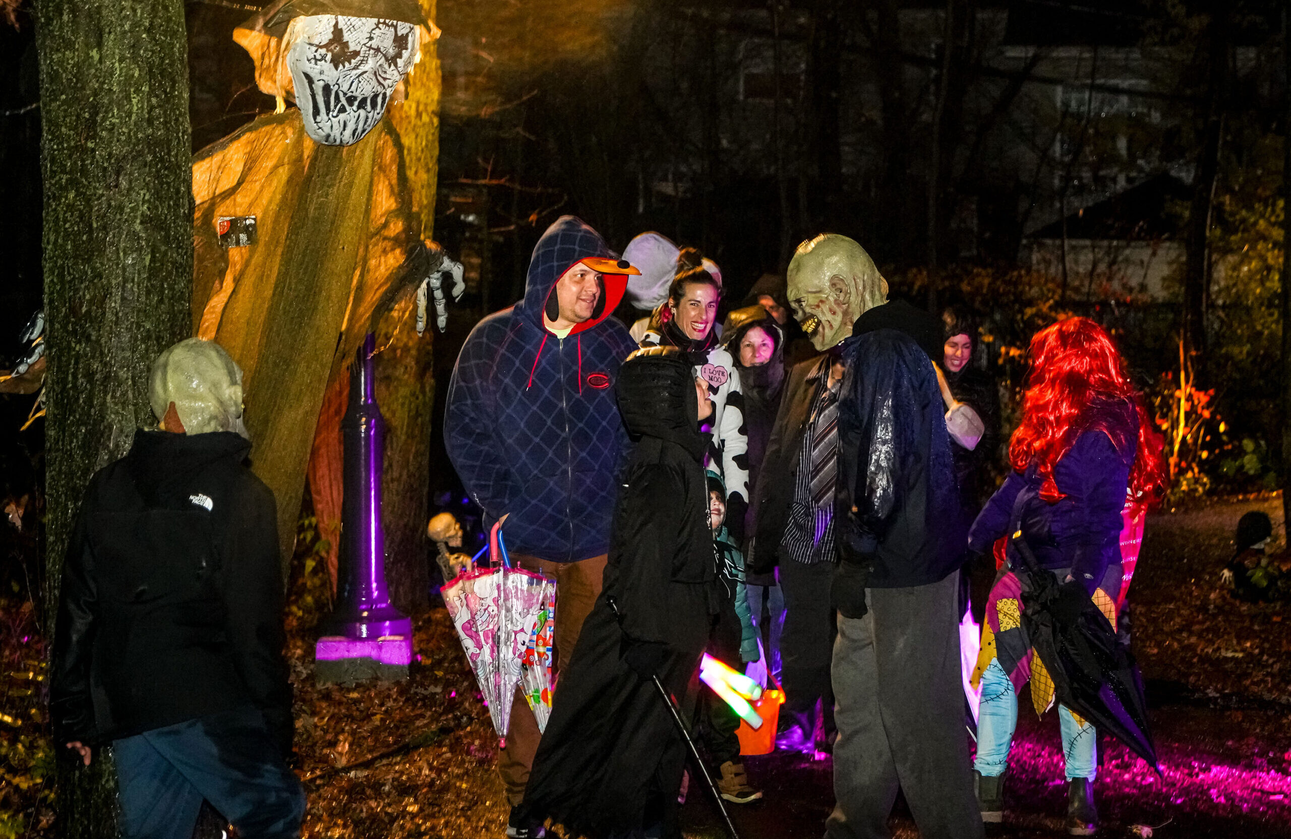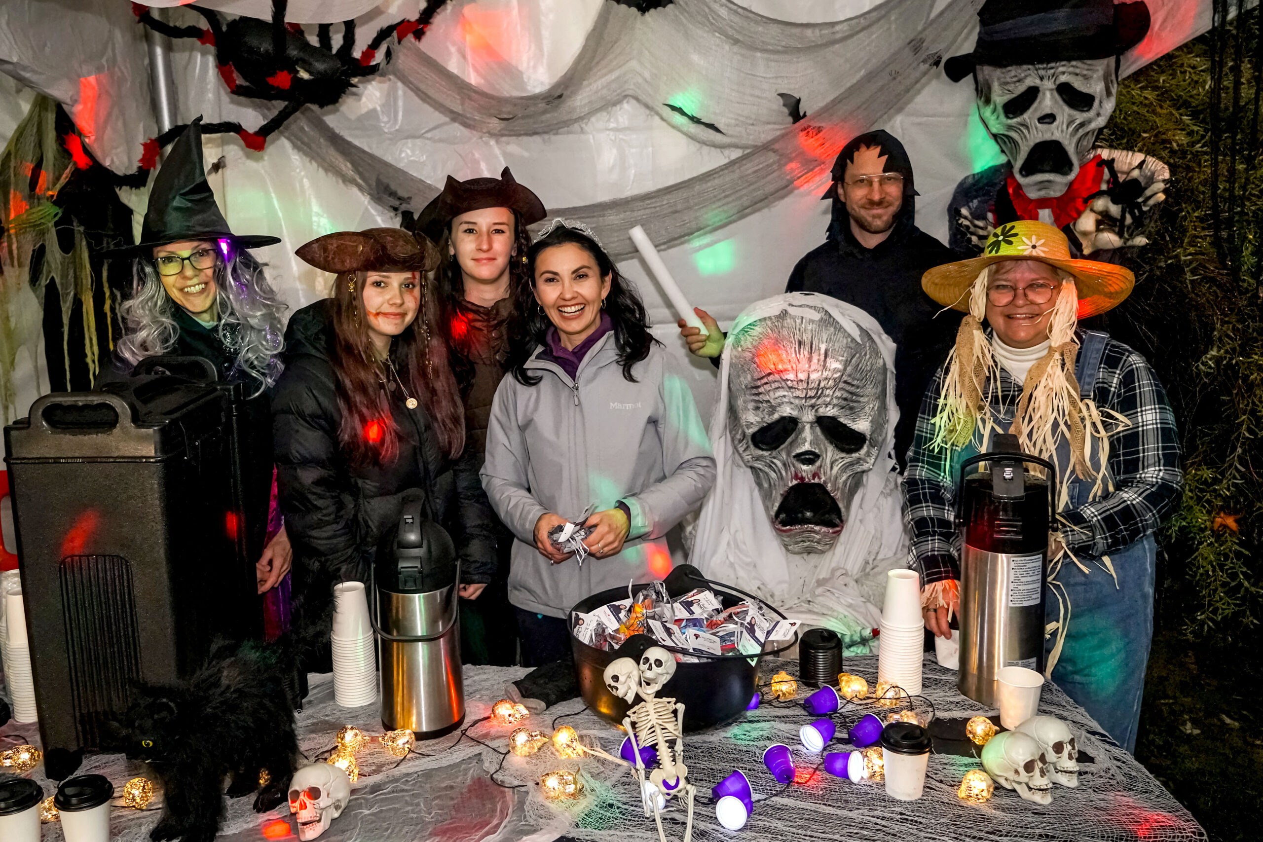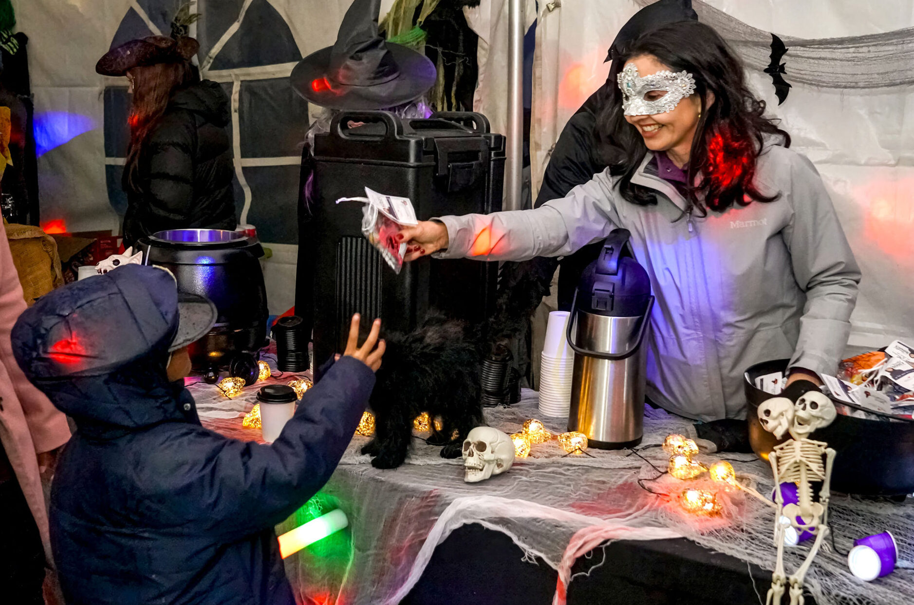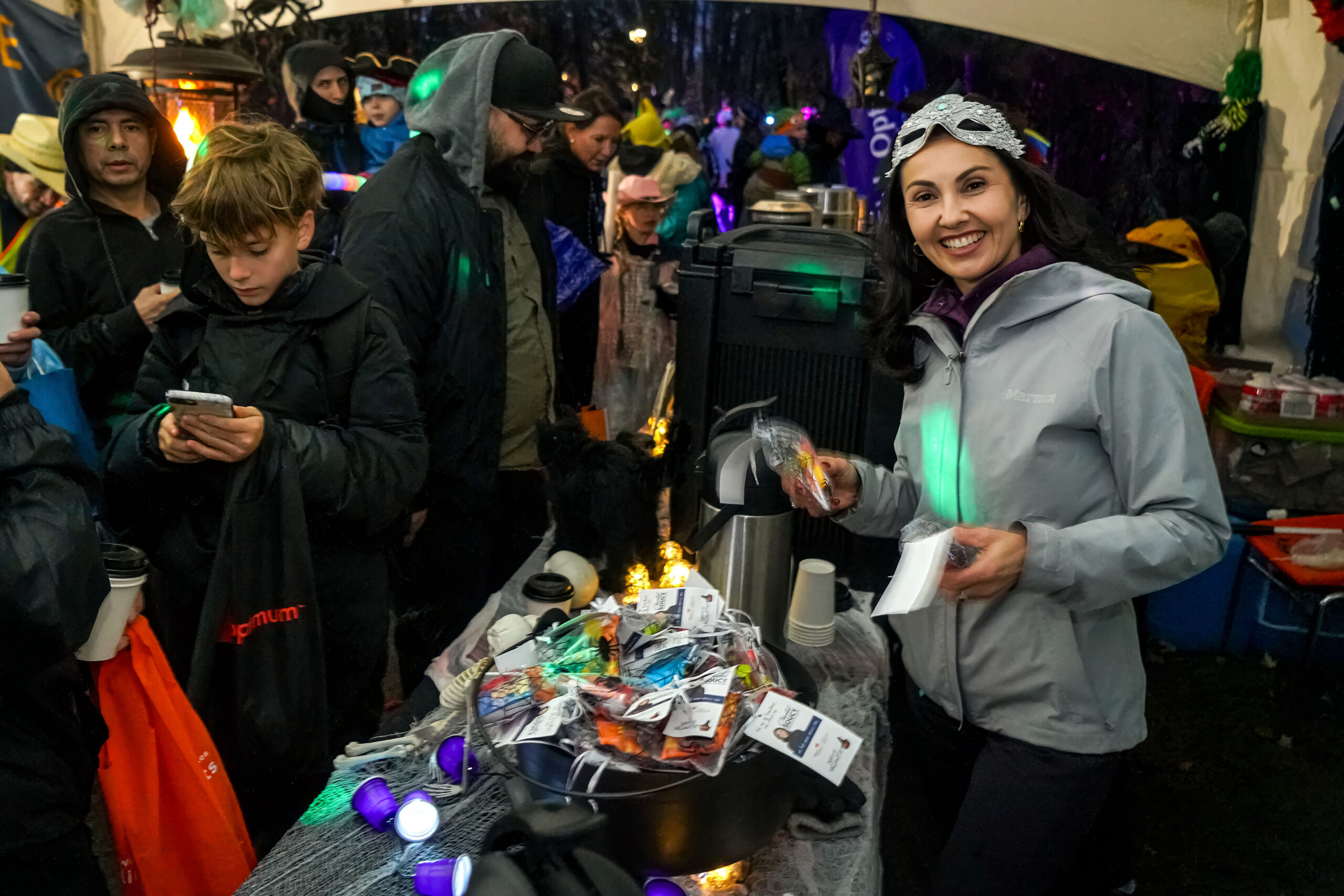 Malgré la pluie, des centaines de visiteurs ont bravé la température pour se rassembler sous le grand chapiteau du parc Jean-Jacques-Leduc, dans le quartier Douville. Mme Soucy et son équipe y ont offert bonbons et chocolat chaud dans une ambiance chaleureuse